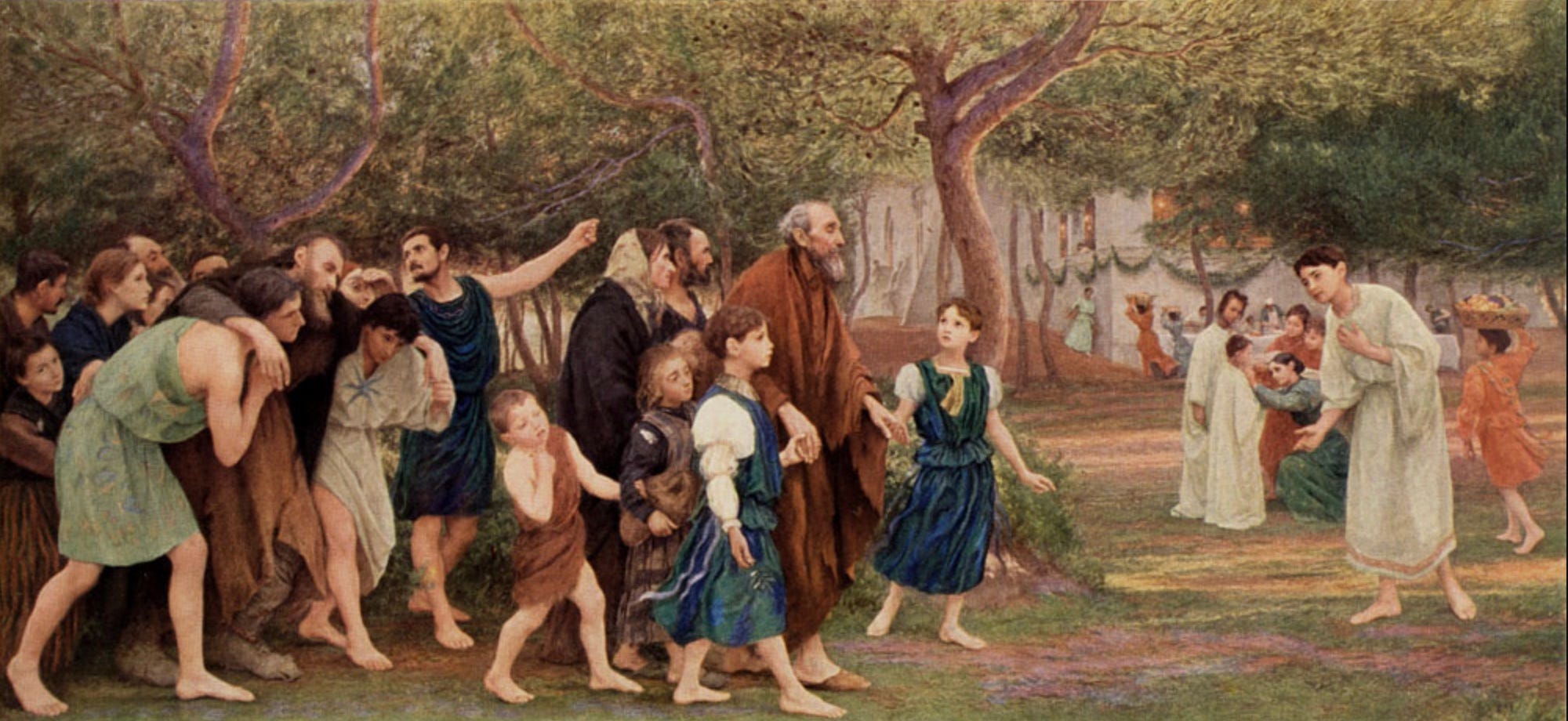 The “beautiful people” all send in their excuses, of course-their real estate, their livestock, their sex lives-so the host sends his social secretary out into the streets to bring in the poor, the maimed, the blind, the lame.