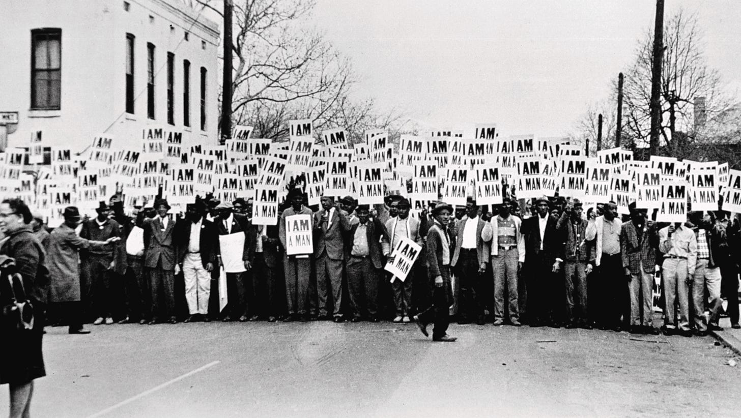 This 1968 photograph by Ernest Withers of a strike by Black sanitation workers in Memphis, Tennessee, suggests with sterling clarity the litany of abuses and injustices that must have been visited upon them. Any of their demands (better pay, working conditions, etc) could have been written across the strikers’ placards. Instead, they unite in a fundamental declaration: I AM A MAN.
